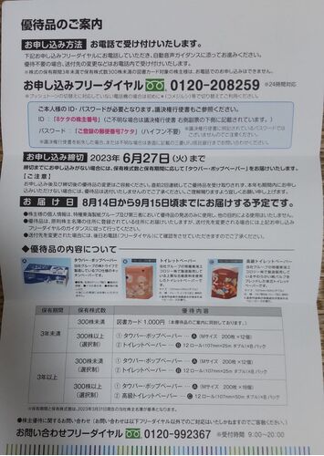 特種東海製紙株式会社 [3708] から株主優待の案内を頂きました(6月上旬)。 株主優待 300株未満を3年以上保有のため以下から選択です。いつも通りトイレットペーパーを頂く予定です。電話での受付となります。 タウパー・ポップペーパー (Mサイズ 200枚 x 12…